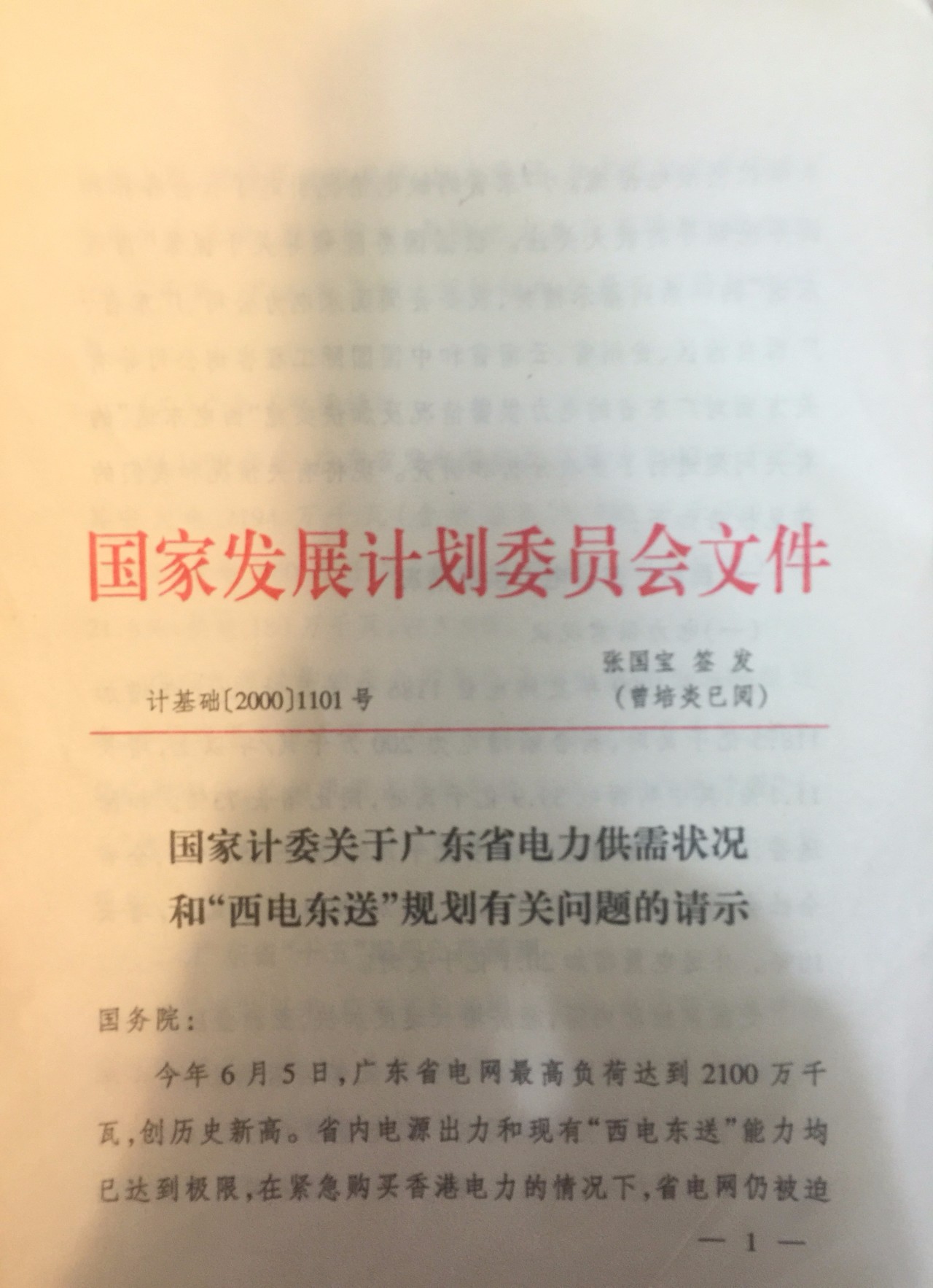 我當(dāng)時(shí)陪同曾培炎同志來(lái)北戴河開(kāi)會(huì),住在國(guó)家計(jì)委的北戴河培訓(xùn)中心。當(dāng)天下午會(huì)散以后曾培炎同志向我傳達(dá)了會(huì)上的情況,要我連夜根據(jù)會(huì)議的精神起草擬就從貴州、云南向廣東送電1000萬(wàn)千瓦的報(bào)告。當(dāng)晚曾培炎主任和我都沒(méi)有返回北京,在北戴河培訓(xùn)中心曾培炎主任親自和我擬就了給國(guó)務(wù)院的西電東送報(bào)告。這就是后來(lái)國(guó)家計(jì)委的[2000]1101號(hào)文(見(jiàn)圖一)。