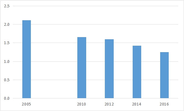 圖3 2005-2016年單位GDP二氧化碳排放(噸CO2/萬元,GDP采用2015年價格)